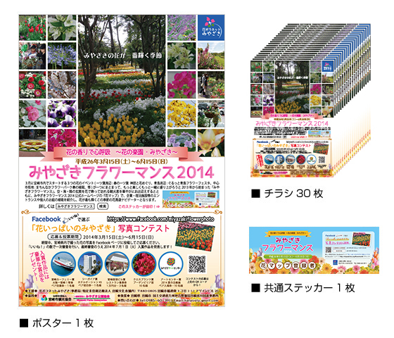 花ボラネットみやざき登録団体・個人には、目印となる共通ステッカー1枚、ポスター1枚、チラシ30枚を1セットとしてお渡しし、当サイトの「花マップ」に情報を掲載いたします。また企業協賛・市民からの寄付も同時にお願いしてまいります。